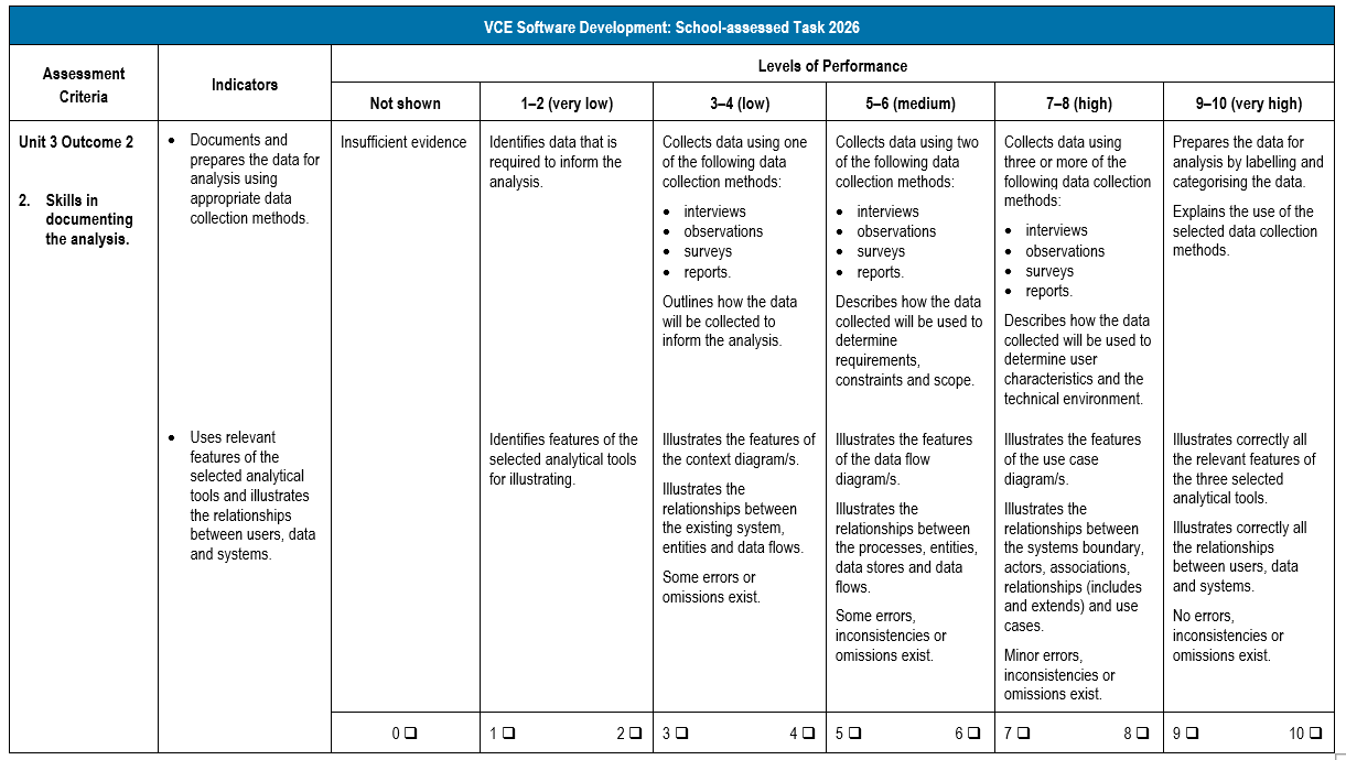 Criterion 2 focuses on skills in documenting the analysis.